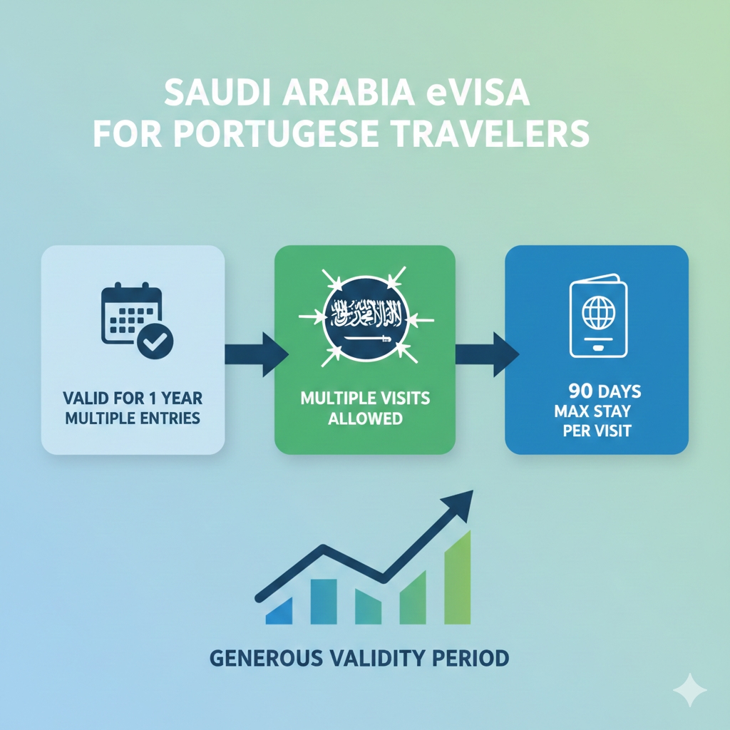 Portuguese travelers receive a multiple-entry eVisa with a generous validity period.