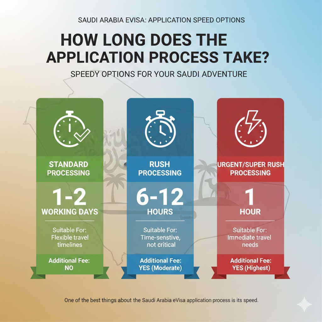 This is the quickest option available. With super rush service, the eVisa is processed within 1 hour, ideal for urgent travel plans or applicants who need immediate approval.